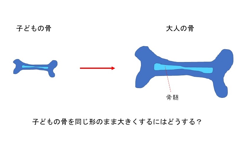 それでは、細胞が増えることが成長なのでしょうか?たとえば骨の場合、骨の成分は骨芽細胞(造骨細胞)という細胞で作られます。子どもの骨も大人の骨と同じように内部が空洞のようになっていて、骨髄という血液を作る組織が入っています。しかし、骨芽細胞で骨の成分が作られるだけであれば、やがて骨は白くて硬い塊になって骨髄は消えてしまします。