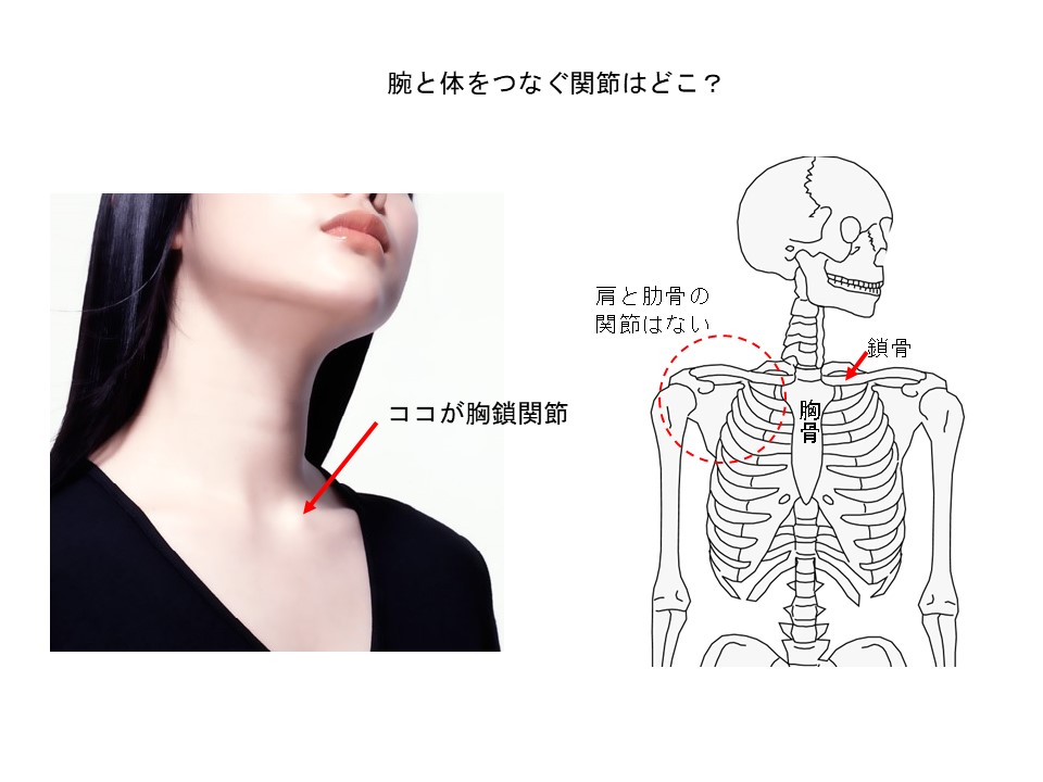 腕と体をつなぐものは何か。当然のことながら、皮膚や筋肉は腕(上肢)を体(体幹)につないでいます。それでは骨はどうでしょう。肩の関節で腕と体がつながっている?いいえ、違います。肩の下にある骨は肋骨ですが、肩の骨と肋骨の間に関節はありません。