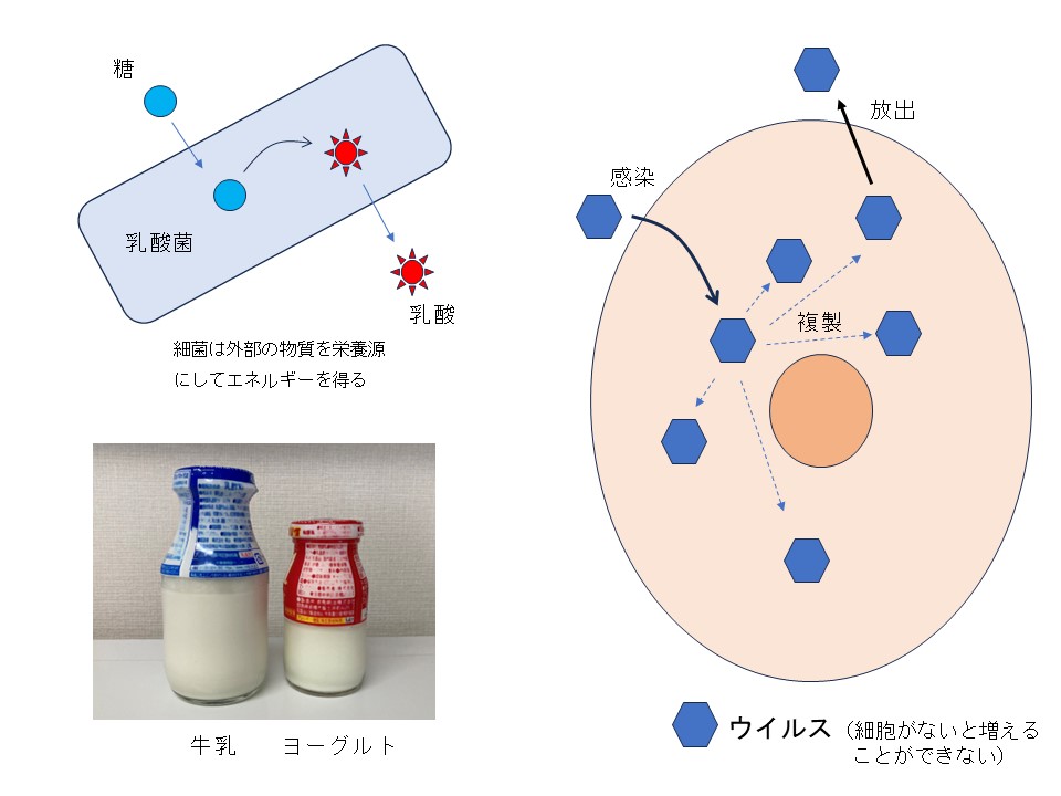ウイルスが生物ではないとする根拠の一つが、自分だけで独立して増殖できないことです。細菌である乳酸菌の場合、外部の糖を乳酸に分解したときに発生するエネルギーで増殖します(牛乳の糖分が乳酸になったものがヨーグルト)。ところが、糖分のような外部の物質をエネルギー源にして増殖するウイルスはこの世に存在しません。ウイルスは他の生物の細胞の中で自分を複製させてもらっている存在であり、細胞の外では自力で増えることができないのです。