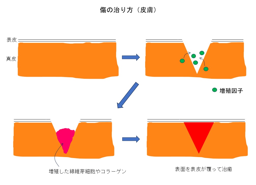 体が傷つくことは日常茶飯事ですが、私たちが生きている限り傷は治ります。もしも傷が治らないとしたら手術なんて危なくてできないし、注射した後は皮膚に穴があいたままです。傷が治る(創傷治癒)のは医学の基本中の基本であって、傷が治らなければ医学が成立しないどころか、そもそも生きていくことができません。