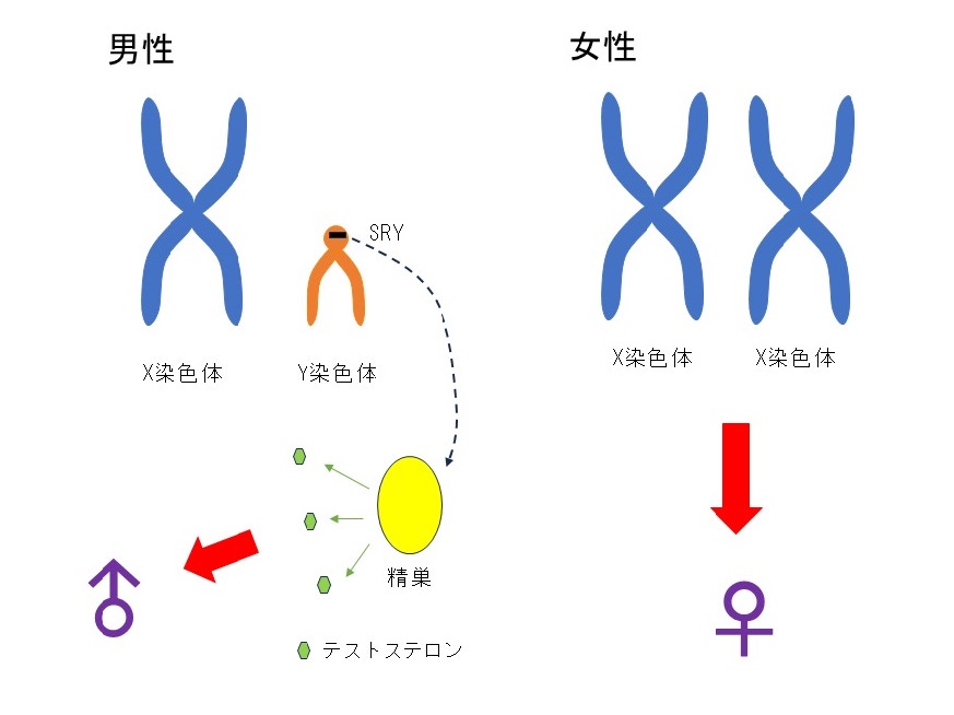 男性の染色体は46,XY、女性の染色体は46,XX。生物学的な男女の別はX、Yという性染色体によって決まります。男性が持つY染色体にはSRY(精巣決定因子)遺伝子が存在していて、このSRYが胎児に働くと体内に精巣が形成されます。精巣はテストステロンなどの男性ホルモンを分泌し、その作用で男性型の性器が形成されます。一方、SRY遺伝子のない46,XXの胎児は精巣ができず、男性ホルモンが分泌されないために卵巣や子宮などを持つ女性型の体になります。