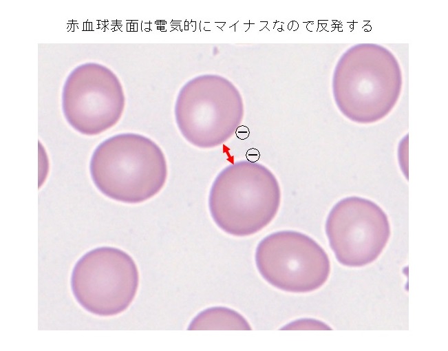 赤血球そのものは、ドロドロ血であってもサラサラ血でも表面がマイナスに荷電しています。血液中には赤血球がぎっしりと含まれていても(血液体積の40%前後が赤血球)、マイナス同士が電気的に反発し合うのでそう簡単に赤血球同士がくっつくことはありません。健康な血液を顕微鏡でみれば赤血球はお互いに離れてバラバラになっています。 感染症などで炎症が起きると抗体(イムノグロブリン)とかフィブリノゲンのようなプラスに荷電するタンパク質が血中に増加してきます。そうしたタンパク質は赤血球表面のマイナス荷電を打ち消してしまうため、赤血球同士がくっつきやすくなります。この場合、赤血球は横1列に並ぶ傾向があって(連銭形成といいます)、イムノグロブリンが増加する多発性骨髄腫などの疾患を見つけるキッカケになることもあります。