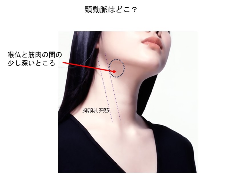 脈を触れるということは心臓がちゃんと動いている証拠です。ところが心臓の動きが悪くなると脈を触れづらくなり、ついには頸動脈で確認できるのみとなります。頸動脈は体の外から脈を触れることができる大動脈に直結した太い動脈です。そのため心臓の拍動を最も間近に触れることができるのです。頸動脈は誰でも名前くらい知っています。ところが、「触ってみて」というと多くの人は正確に指し示すことができません。頸動脈を皮膚の上から触れられる場所は、図のように喉仏と胸鎖乳突筋(耳の後ろ付近から首の前を斜め下に通る筋肉)の間の部分です。イザというときのために知っておきましょう。ただし、無理に押すのは危険ですよ。